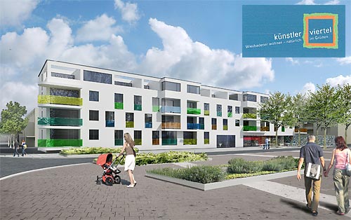 | Im Herzen von Wiesbaden entsteht auf einem 120'000 m2 grossen Grundstücksareal das moderne Wohnquartier " Künstlerviertel". | |